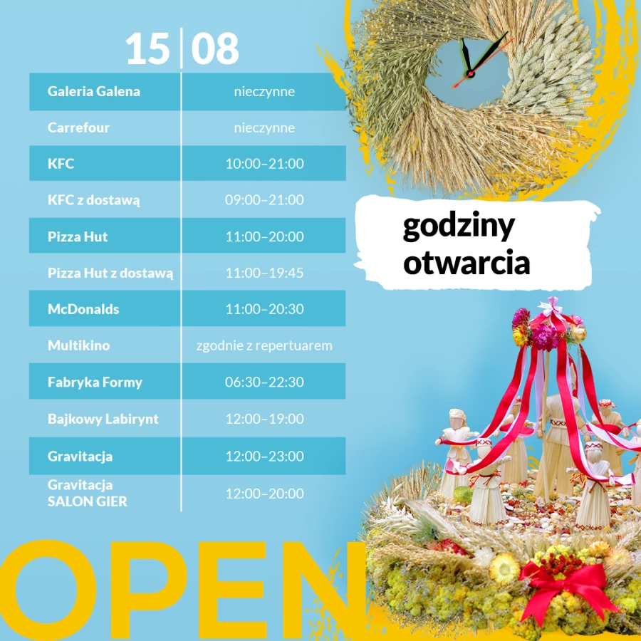 15 sierpnia w Święto Wojska Polskiego i Wniebowzięcia Najświętszej Maryi Panny sklepy Galerii Galena będą nieczynne!
