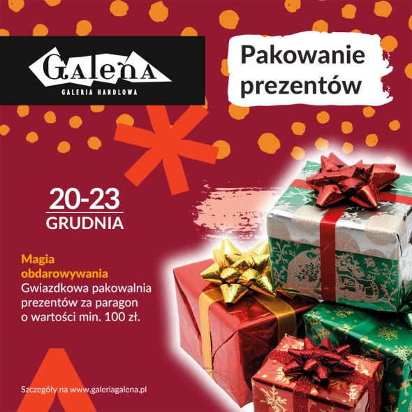 Wystarczy, że w dniach 16 – 23 grudnia br. zrobisz zakupy świątecznych podarków w Galerii Galena za kwotę min. 100 zł (na 1 paragonie), a następnie w dniach 20 – 23 grudnia br. zgłosisz się do Punktu Pakowania Prezentów, okażesz paragon, a nasze Świąteczne Hostessy zadbają o piękne opakowanie podarku.