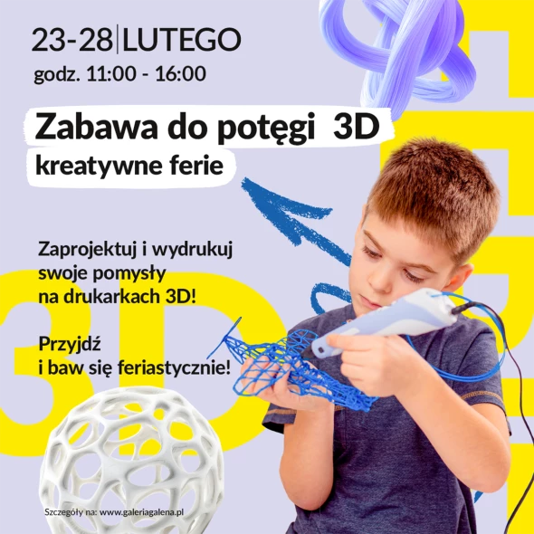 W tym roku ferie w Galerii Galena wchodzą w trzeci wymiar! A to za sprawą kreatywnych warsztatów, które zamieniają wyobraźnię w rzeczywistość. Codziennie od 23 do 28 lutego, w godzinach 11:00 - 16:00, zapraszamy do Galerii Galena ze swoimi dziećmi - gwarantujemy niezapomnianą zabawę podczas FERII W 3D!