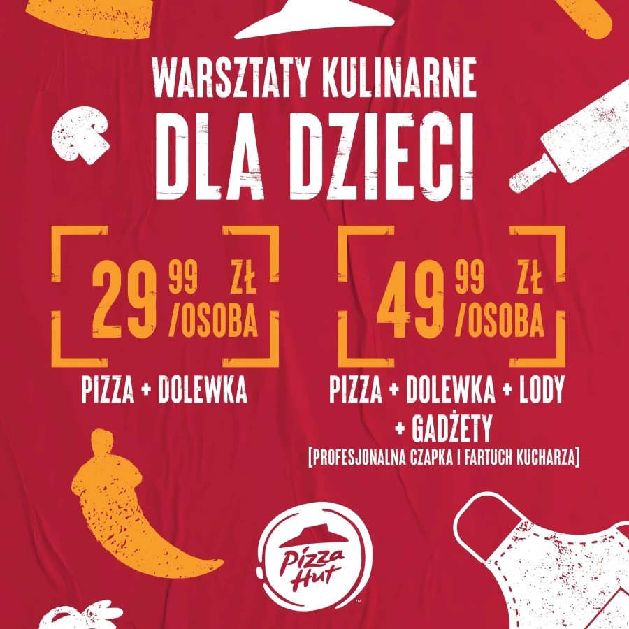 - Za jedyne 49.99 mamy własnoręcznie robioną małą pizzę + napój + małe lody B&J + uczestnik otrzyma zestaw małego kucharza ( czapka i fartuch kucharski z logo Pizza Hut ) oraz dyplom ukończenia warsztatów + gadżety.