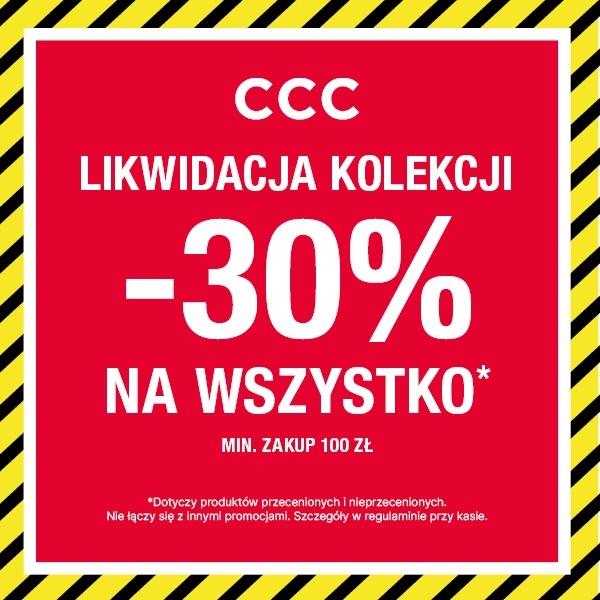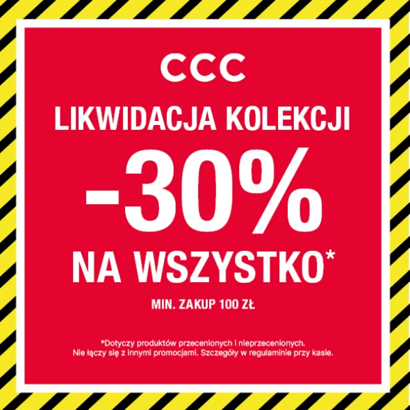 LIKWIDACJA KOLEKCJI w CCC! -30% na WSZYSTKO przy zakupach za minimum 100zł! Tak na WSZYSTKO. Buty, torebki i akcesoria znanych marek kupisz teraz 30% taniej! Kup, zanim najlepsze modele znikną! Promocja obowiązuje w salonach CCC. Szczegóły w regulaminie